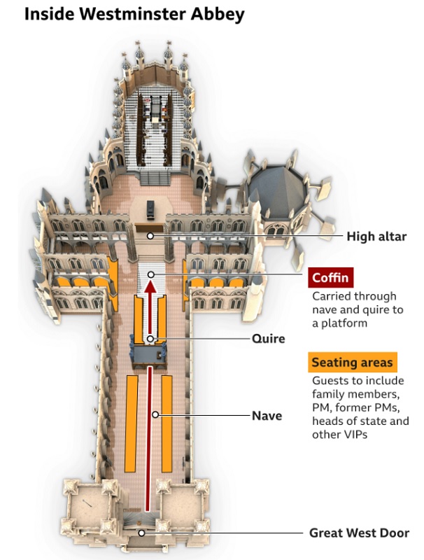 The day will begin as the Queen's coffin is carried from Westminster Hall to Westminster Abbey on the State Gun Carriage of the Royal Navy.