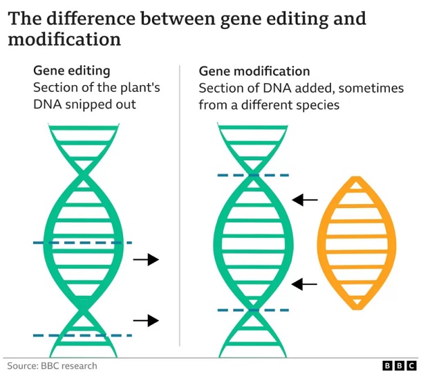 Gene-editing (GE), which is a much newer technique that lets scientists target specific genes. The new law lets plant breeders switch them on or off by removing a small section of DNA - again, provided the resulting crop could have been naturally produced.