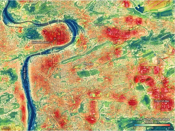 A heat map taken during a heatwave in Prague shows water and green spaces can cool cities (Credit: European Space Agency)