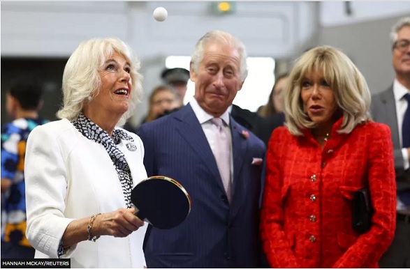 The UK's Queen Camilla plays table tennis next to King Charles and Brigitte Macron, wife of French President Emmanuel Macron, as they meet members of local youth sports associations in Saint-Denis near Paris, on the second day of their State visit to France.